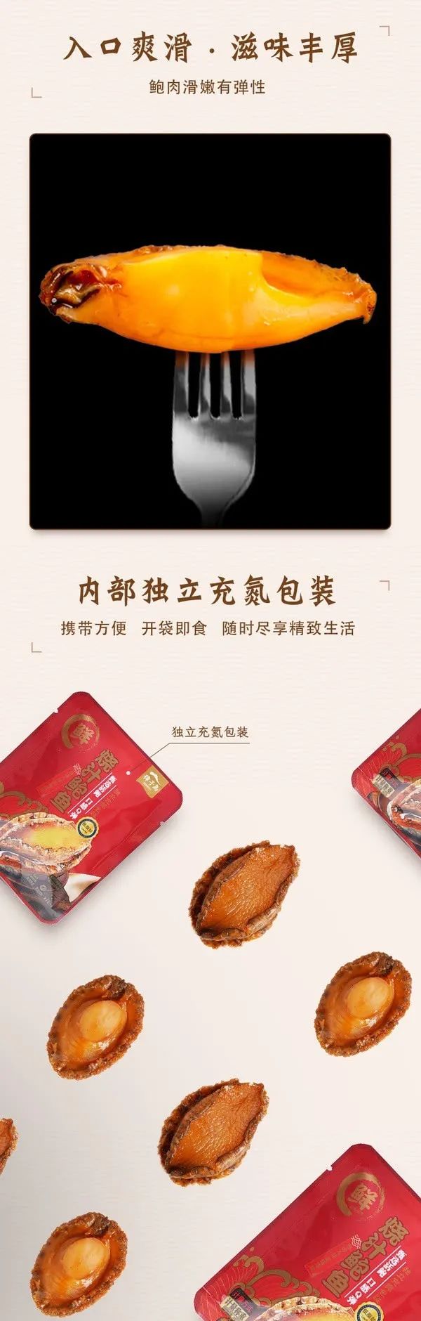 燒汁鮑魚(yú)采用獨(dú)立小包裝,更符合現(xiàn)代人的飲食習(xí)慣,口袋里的小零食,揣兜里隨時(shí)開(kāi)吃。