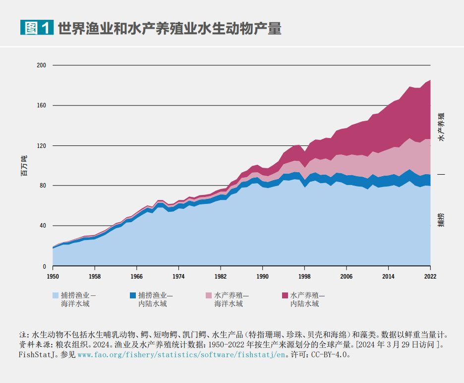 1950-2022年世界漁業(yè)和水產(chǎn)養(yǎng)殖業(yè)水生動(dòng)物產(chǎn)量變化圖。?糧農(nóng)組織