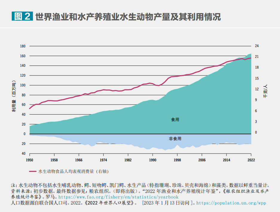1950-2022年世界漁業(yè)和水產(chǎn)養(yǎng)殖業(yè)水生動(dòng)物產(chǎn)量及其利用情況。?糧農(nóng)組織