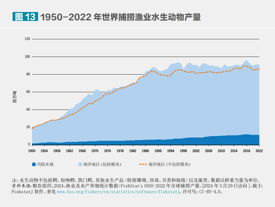 1950-2022 年世界捕撈漁業(yè)水生動(dòng)物產(chǎn)量。?糧農(nóng)組織