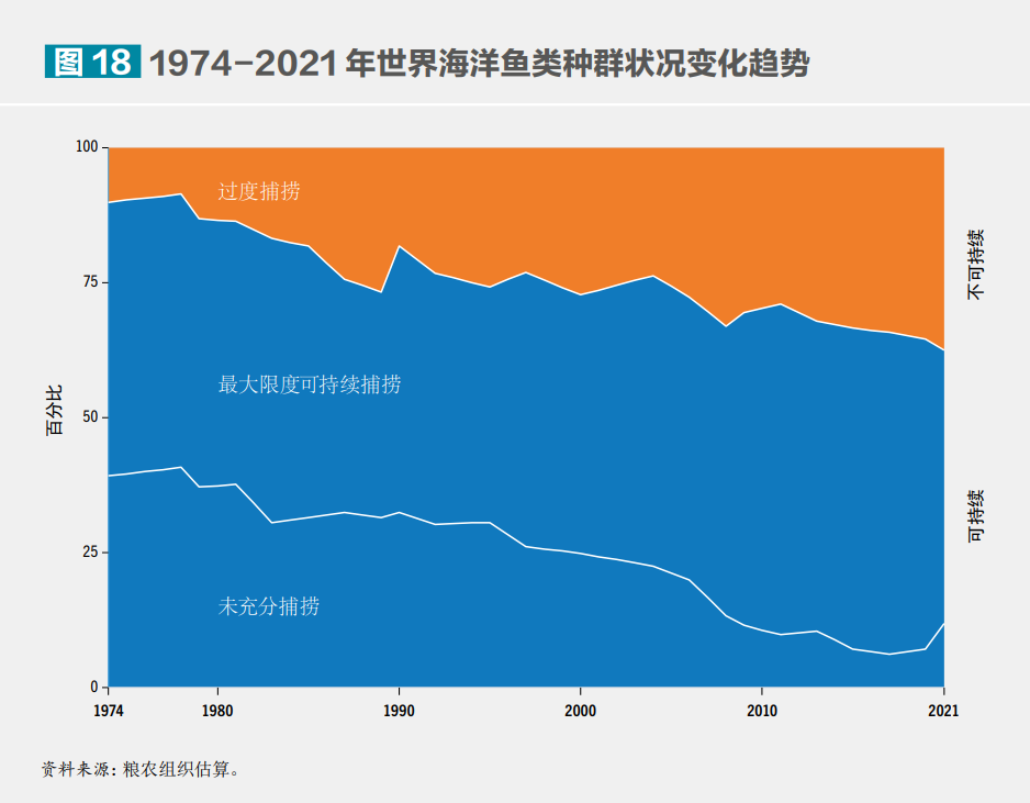 1974-2021年世界海洋魚(yú)類(lèi)種群狀況變化趨勢(shì)。?糧農(nóng)組織