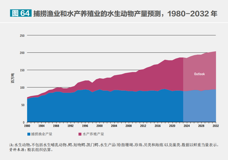 捕撈漁業(yè)和水產(chǎn)養(yǎng)殖業(yè)的水生動(dòng)物產(chǎn)量預(yù)測(cè),1980-2032年。?糧農(nóng)組織
