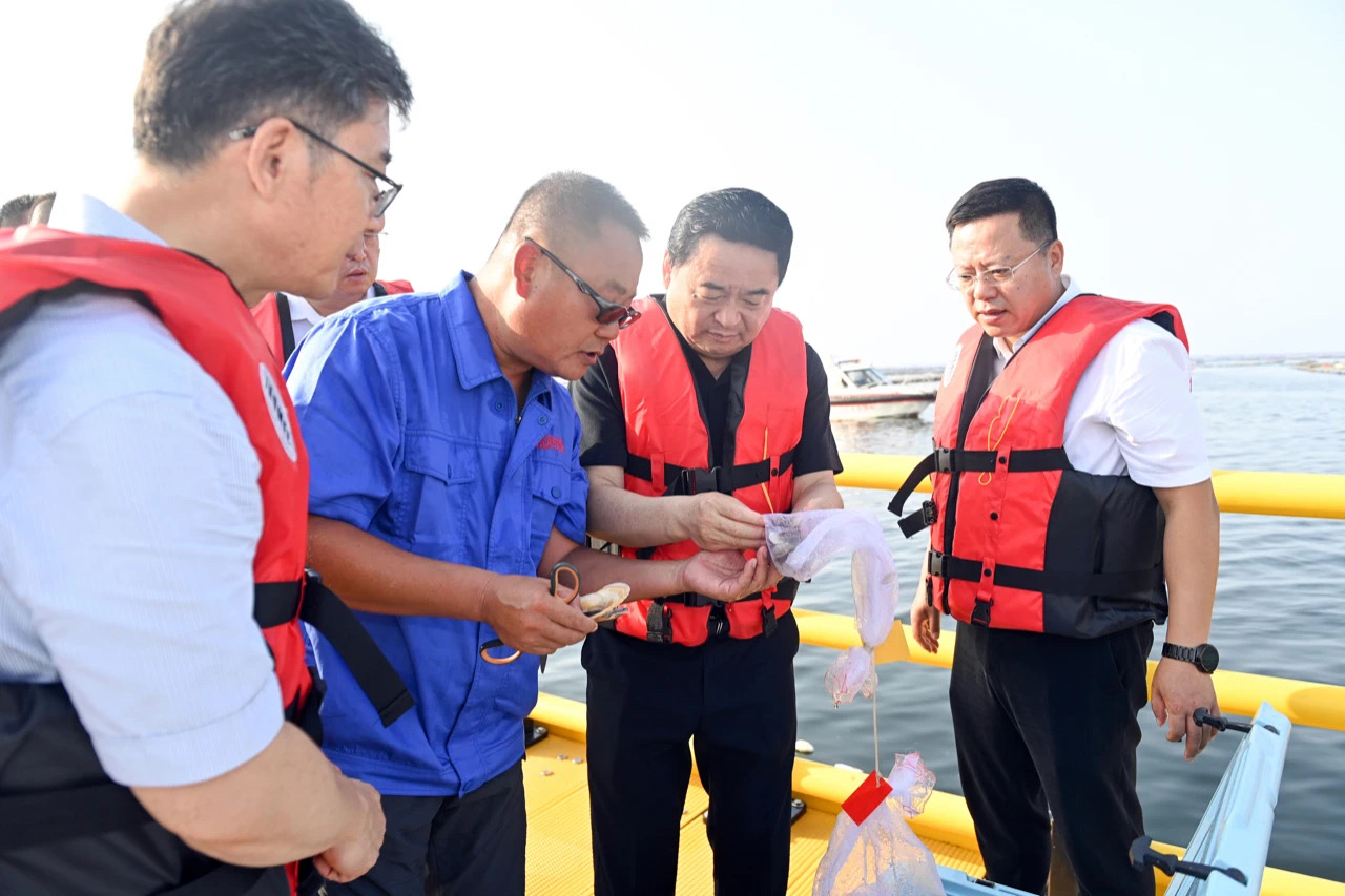 圖片▲省委書記、省人大常委會主任郝鵬來到大連壹鮮冷水海產(chǎn)品有限公司海產(chǎn)品養(yǎng)殖海域,考察海洋牧場建設情況。