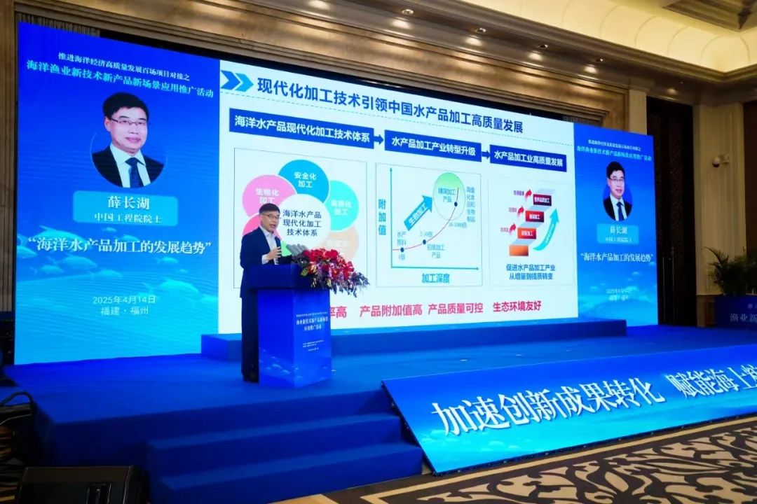 在主旨報(bào)告環(huán)節(jié),劉少軍以《魚類良種良養(yǎng)良銷》為題,聚焦魚類遺傳育種,分享了合方鯽等優(yōu)質(zhì)魚類育種成果,并強(qiáng)調(diào)生態(tài)養(yǎng)殖模式創(chuàng)新,提出通過“良種+良養(yǎng)+良銷”全鏈條創(chuàng)新提升漁業(yè)競爭力。薛長湖以《海洋水產(chǎn)品加工的發(fā)展趨勢》為題,分析了海洋食品加工的高值化、綠色化趨勢,指出當(dāng)前水產(chǎn)品加工領(lǐng)域存在的品質(zhì)參差不齊、技術(shù)創(chuàng)新不足等問題,并分享了團(tuán)隊(duì)在生物加工、營養(yǎng)功能化加工、冷凍保鮮技術(shù)等方面的創(chuàng)新成果。
