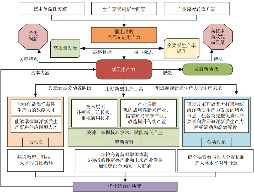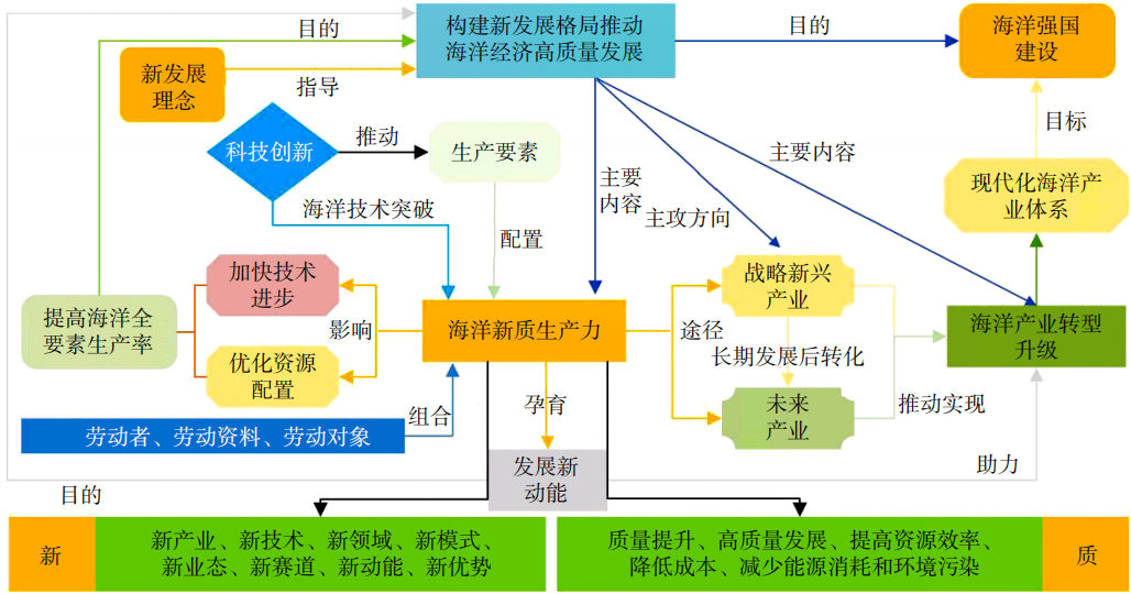 海洋經(jīng)濟(jì)作為國民經(jīng)濟(jì)的重要組成部分,其發(fā)展不僅為國家的經(jīng)濟(jì)增長注入新動力,更為推動海洋科技創(chuàng)新、提升海洋產(chǎn)業(yè)競爭力提供廣闊空間。建設(shè)海洋強(qiáng)國,是以習(xí)近平同志為核心的黨中央基于國家發(fā)展大局的時代要求,也是中國特色社會主義事業(yè)的關(guān)鍵環(huán)節(jié)?;诖?,我們在深入學(xué)習(xí)新質(zhì)生產(chǎn)力權(quán)威解釋內(nèi)涵的基礎(chǔ)上,結(jié)合海洋經(jīng)濟(jì)發(fā)展現(xiàn)狀,進(jìn)一步解讀海洋新質(zhì)生產(chǎn)力的概念及內(nèi)涵,初步提出海洋新質(zhì)生產(chǎn)力的理論框架,并探索發(fā)展海洋新質(zhì)生產(chǎn)力的實(shí)施路徑,以期為進(jìn)一步踐行海洋強(qiáng)國戰(zhàn)略,促進(jìn)海洋經(jīng)濟(jì)高質(zhì)量發(fā)展提供理論價值與實(shí)踐參考。