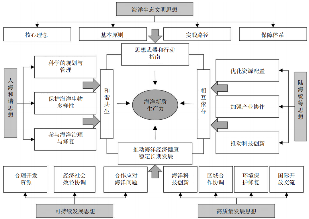 海洋生態(tài)文明思想,作為人類對海洋環(huán)境及其生態(tài)系統(tǒng)的新認(rèn)識,強(qiáng)調(diào)人與自然和諧共生的理念,核心理念為尊重自然、順應(yīng)自然、保護(hù)自然。海洋生態(tài)文明思想不僅指導(dǎo)著海洋資源的合理利用和保護(hù),還推動著海洋經(jīng)濟(jì)的綠色轉(zhuǎn)型,影響海洋新質(zhì)生產(chǎn)力的形成。