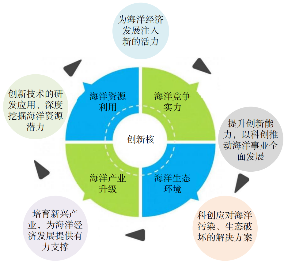 海洋科技創(chuàng)新是推動海洋新質(zhì)生產(chǎn)力發(fā)展的強(qiáng)大引擎,也是引領(lǐng)海洋經(jīng)濟(jì)騰飛的先導(dǎo)力量。海洋科技創(chuàng)新的重要性,不僅在其催生新產(chǎn)業(yè)、新模式、新動能,更在于其對于提升海洋資源利用效率、保護(hù)海洋生態(tài)環(huán)境、增強(qiáng)國家海洋競爭力等方面具有深遠(yuǎn)影響(圖6)。