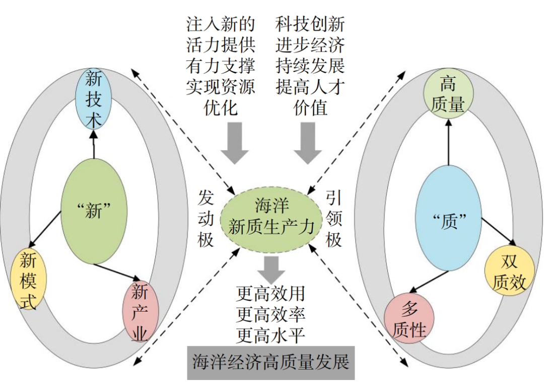 海洋新質(zhì)生產(chǎn)力,新是其發(fā)展的原動力“發(fā)動極”,不斷推動生產(chǎn)力的解放與發(fā)展,并為其注入新的活力。同時,質(zhì)是其引領(lǐng)的方向“引領(lǐng)極”,通過不斷拓展人類效用的邊界和豐富社會福利的內(nèi)涵,降低對海洋環(huán)境的壓力,實(shí)現(xiàn)海洋經(jīng)濟(jì)的可持續(xù)發(fā)展,促進(jìn)生產(chǎn)力體系向更高質(zhì)量、更高效率和更高水平邁進(jìn)(圖7)。