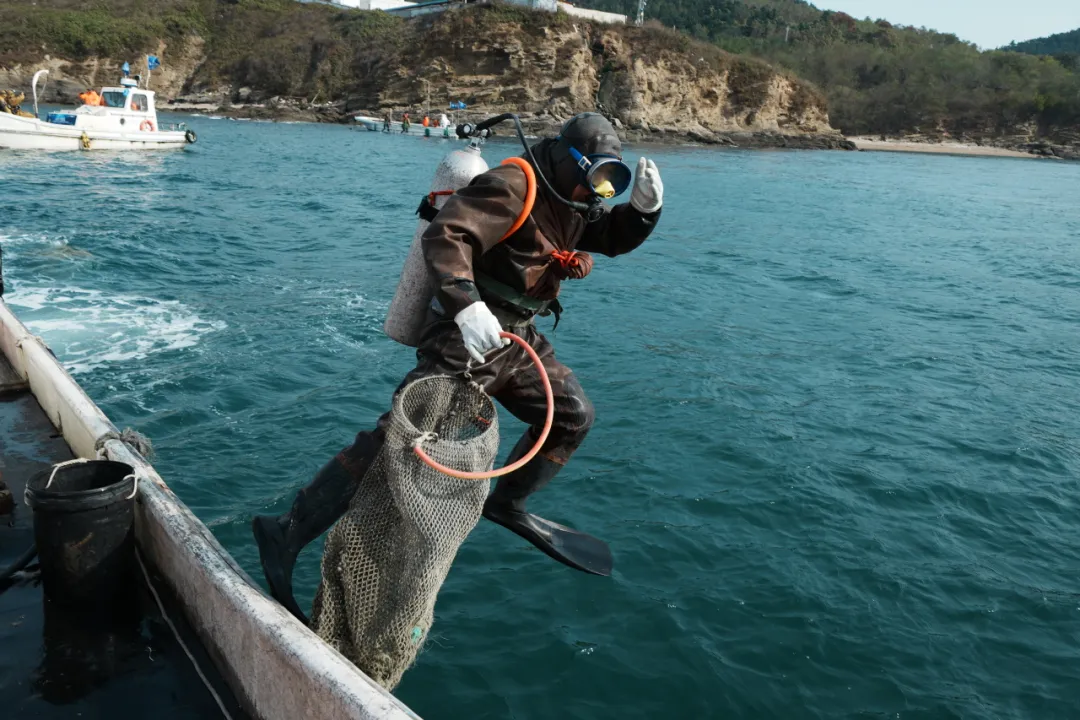 冬捕節(jié)當(dāng)天,20余名潛水員莊嚴(yán)宣誓:“感恩生態(tài),限量采捕”,鏗鏘誓言彰顯了獐子島人對(duì)海洋的敬畏與感恩。伴隨著悠揚(yáng)的冬捕節(jié)主題曲《采參謠》,現(xiàn)場(chǎng)氣球冉冉升起、彩煙飛揚(yáng)、采捕船齊聲?shū)Q笛,全副武裝的潛水員們分乘捕撈船劈波斬浪,奔赴獐子島馬牙灘海域——這一聞名遐邇的純種野生源刺參原生態(tài)棲息地。