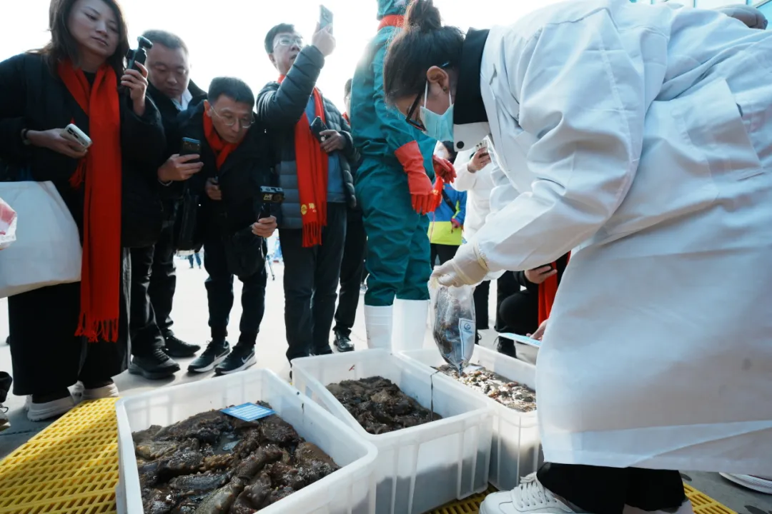 馬牙灘海域位于獐子島西北側(cè),是大連地區(qū)罕有的野生源刺參核心產(chǎn)區(qū)。近50名潛水員整理裝備后傾身入海,約十分鐘后相繼浮出水面,每人手中滿載著20余斤源刺參。船上工作人員立即進(jìn)行現(xiàn)場(chǎng)分揀,并詳細(xì)記錄采捕時(shí)間、海域、船號(hào)、潛水員及海參數(shù)量等信息,為原產(chǎn)地二維碼追溯體系提供精準(zhǔn)數(shù)據(jù)支撐。