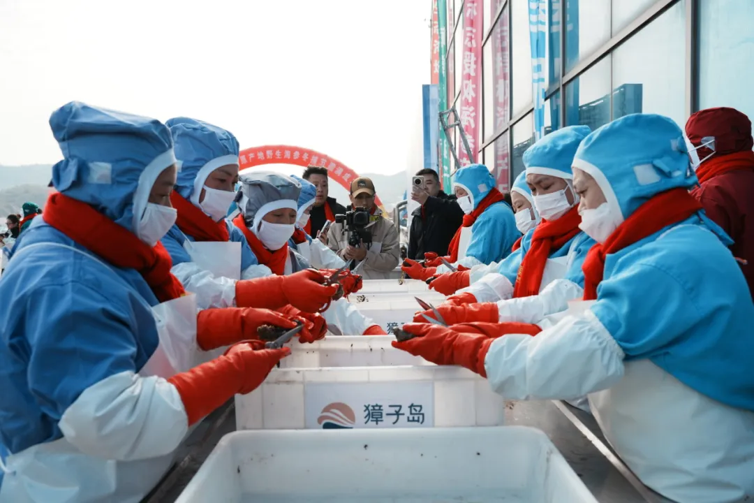 經(jīng)檢測(cè)的源刺參隨即送至加工區(qū),技藝嫻熟的加工人員熟練地進(jìn)行剖洗、去臟、清洗,隨后投入岸邊一字排開(kāi)的四口1米多的大鐵鍋。灶中柴火正旺,鍋中熱氣蒸騰,“冬捕第一鍋”的烹煮場(chǎng)景,不僅讓現(xiàn)場(chǎng)嘉賓大飽口福,更通過(guò)直播鏡頭讓千萬(wàn)網(wǎng)友云端共鑒。