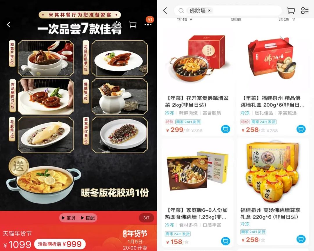 淘寶發(fā)布的年夜飯菜單中,佛跳墻連續(xù)三年穩(wěn)居高位。這款以工序復(fù)雜、食材豐富、烹飪耗時聞名的“閩菜之王”,毫不夸張地說,已經(jīng)在預(yù)制菜浪潮中泛濫成災(zāi),從拼多多到淘寶,從8.8元到468元,佛跳墻幾乎成了年夜飯中的硬通貨。