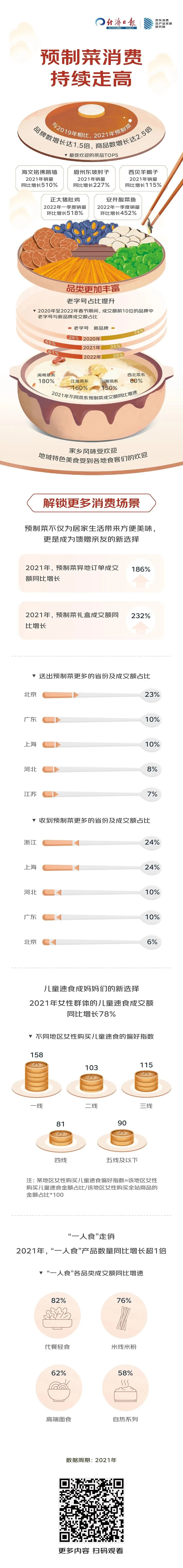 一方面,從品牌、口味、菜系分析不難發(fā)現(xiàn),很多消費者想通過預(yù)制菜在家里輕松吃出“下館子”的感覺,因此在線下餐飲市場上占據(jù)主導(dǎo)地位的菜系、菜品和知名品牌,很自然地在預(yù)制菜市場中唱主角。2021年閩粵菜系、江淮菜系、川湘菜系和西北菜系預(yù)制菜商品成交額分別同比增長180%、160%、150%和80%。老字號入局雖晚,但增速快,展示出品牌對消費者的深遠影響力,實現(xiàn)了“后發(fā)先至”。